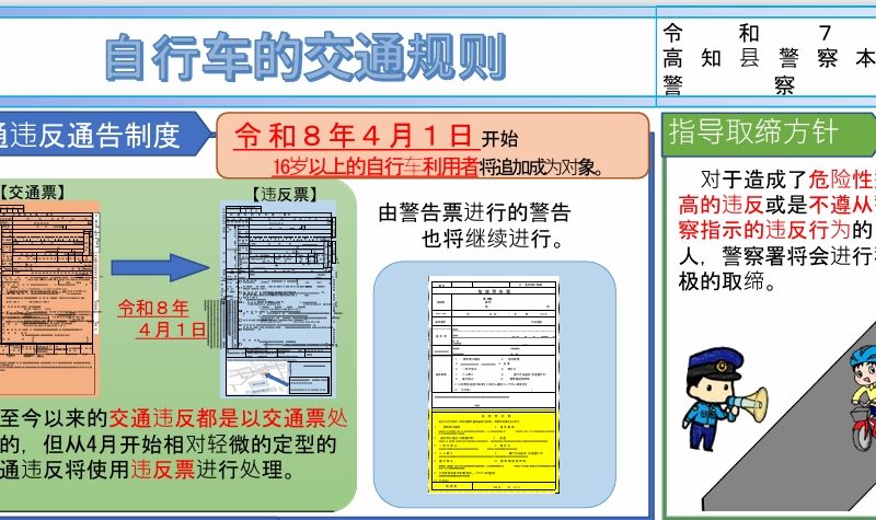 从·2026年4月1日开始将以16岁以上的驾驶者为对象导入对自行车交通违法的【交通违反通告制度】(罚金制度)