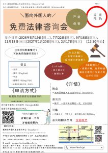 | 面向外国人的法律咨询会 2026年 5月 19日(周二)、7月 22日(周三)、9月 16日(周三)、11月 18日(周三) 2027年 1月 20日(周三)、2月 17日(周三) 开始时间为下午1时30分 免费。 ※如需在上述日期以外进行咨询,请联系Kocoforre。 |