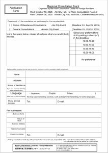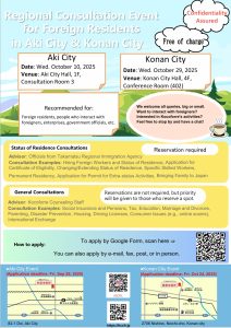 | When? | ・Aki City Consultation Event: Wednesday, October 1st, 2025 1:00 PM – 4:00 PM・Konan City Consultation Event: Wednesday, October 29th, 2025 1:00 PM – 4:00 PM |