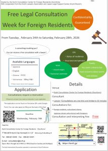From Tuesday 24 February to Saturday 28 February 2026, we will be holding a “Legal Consultation Week for Foreign Residents” event at Kochi Consultation Center for Foreign Residents (Kocoforre).
