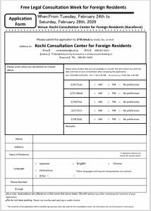 | Application process | Please download and fill in the application form below before returning it to the Kochi Consultation Center for Foreign Residents by email, fax or post before Wednesday 18th February 2026. ・Consultations are assigned based on the order of arrival of application forms.・Google form is also available to apply. |