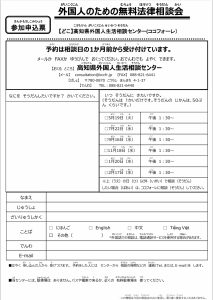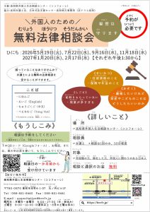 | がいこくじんの ための 法律相談会(ほうりつ そうだん かい) 2026ねん 5がつ 19にち(かようび)、7がつ 22にち(すいようび)、9がつ 16にち(すいようび)、 11がつ 18にち(どようび) 2027ねん 1がつ 20にち(すいようび)、2がつ 17にち(すいようび) じかんは それぞれ 午後(ごご) 1じ 30ふん から。 無料(むりょう)です。 ※うえの ひ いがいで そうだん したい ばあいは、 ココフォーレに そうだん してください。 |