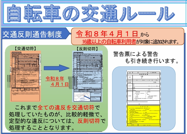 2026年(ねん)4月(がつ)1日(ついたち)から自転車(じてんしゃ)の交通違反(こうつういはん)に対(たい)して「交通反則通告制度(こうつうはんそくつうこくせいど)」(反則金(はんそくきん))が導入(どうにゅう)され、16歳(さい)以上(いじょう)の運転者(うんてんしゃ)が対象(たいしょう)となります。